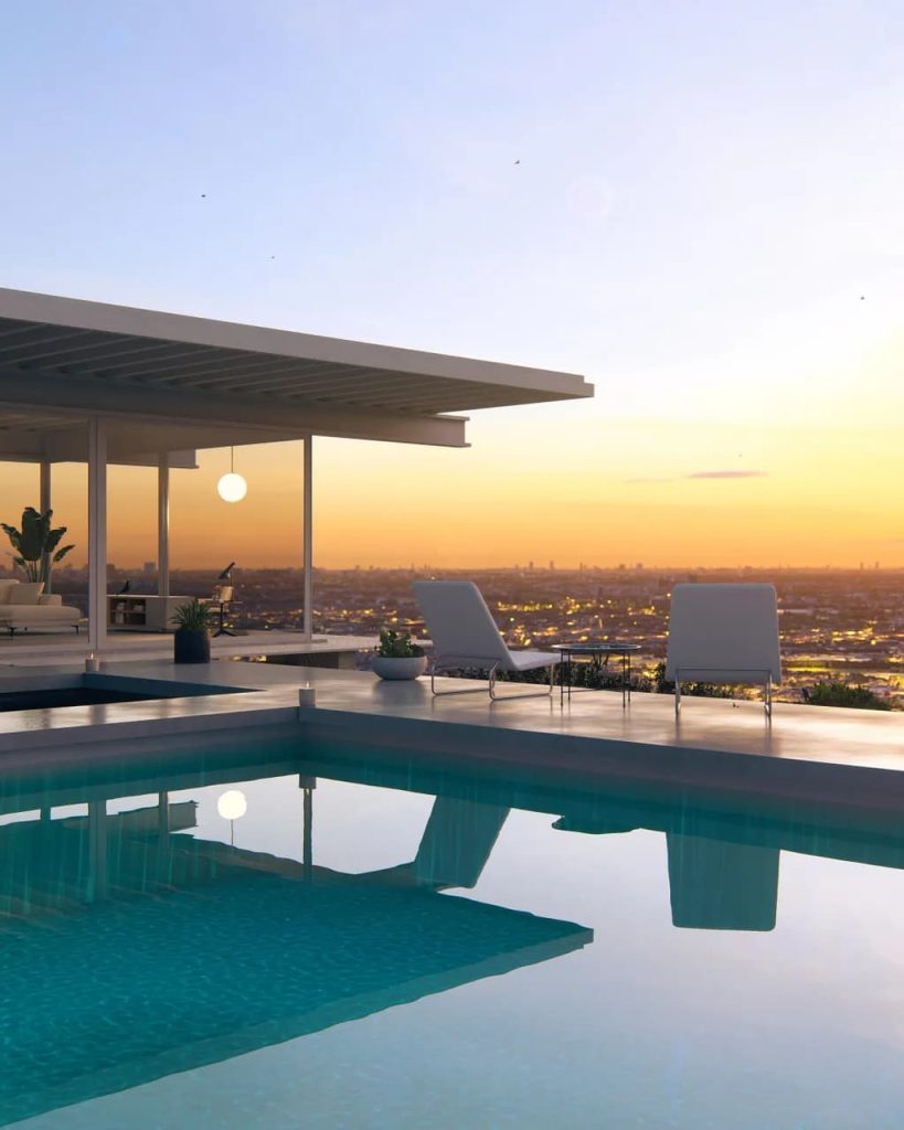 この映像では、3ds Maxのカスタムカメラパス機能を巧みに活用し、キッチンからリビング空間を通り抜け、最終的にはロサンゼルスの壮大な景色を望む構成になっています。建築体験をそのまま映像化したような、流れるようなシークエンスが特徴です。