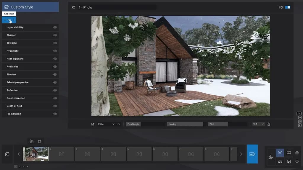 たとえば、リアルスカイ、2点透視、反射、カラー補正、被写界深度、降水エフェクトなど、理想的な組み合わせが見つかったら、カスタムFXスタックとして保存しておきましょう。こうすることで、新しいシーンにも同じ雰囲気をすぐに適用できます。