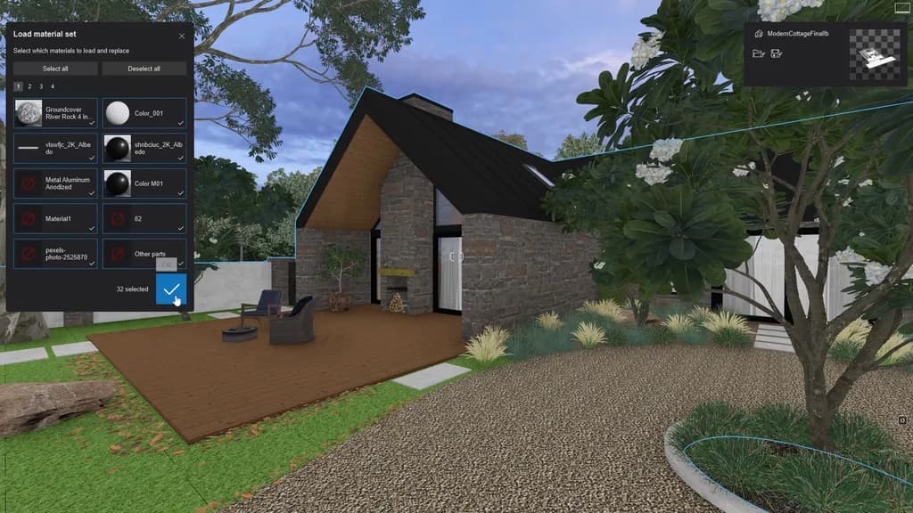 この仕組みを最大限に活かせるのが、LumionのLiveSync機能です。モデリングソフトを起動したままLiveSyncを実行し、マテリアルセットを読み込むと、物理ベースレンダリング(PBR)特性を持つマテリアルが即座にLumion側へ反映されます。
