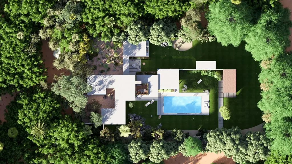 上空からの正投影ビューを使い、建物と敷地・周辺環境の関係を明確に表現できます。